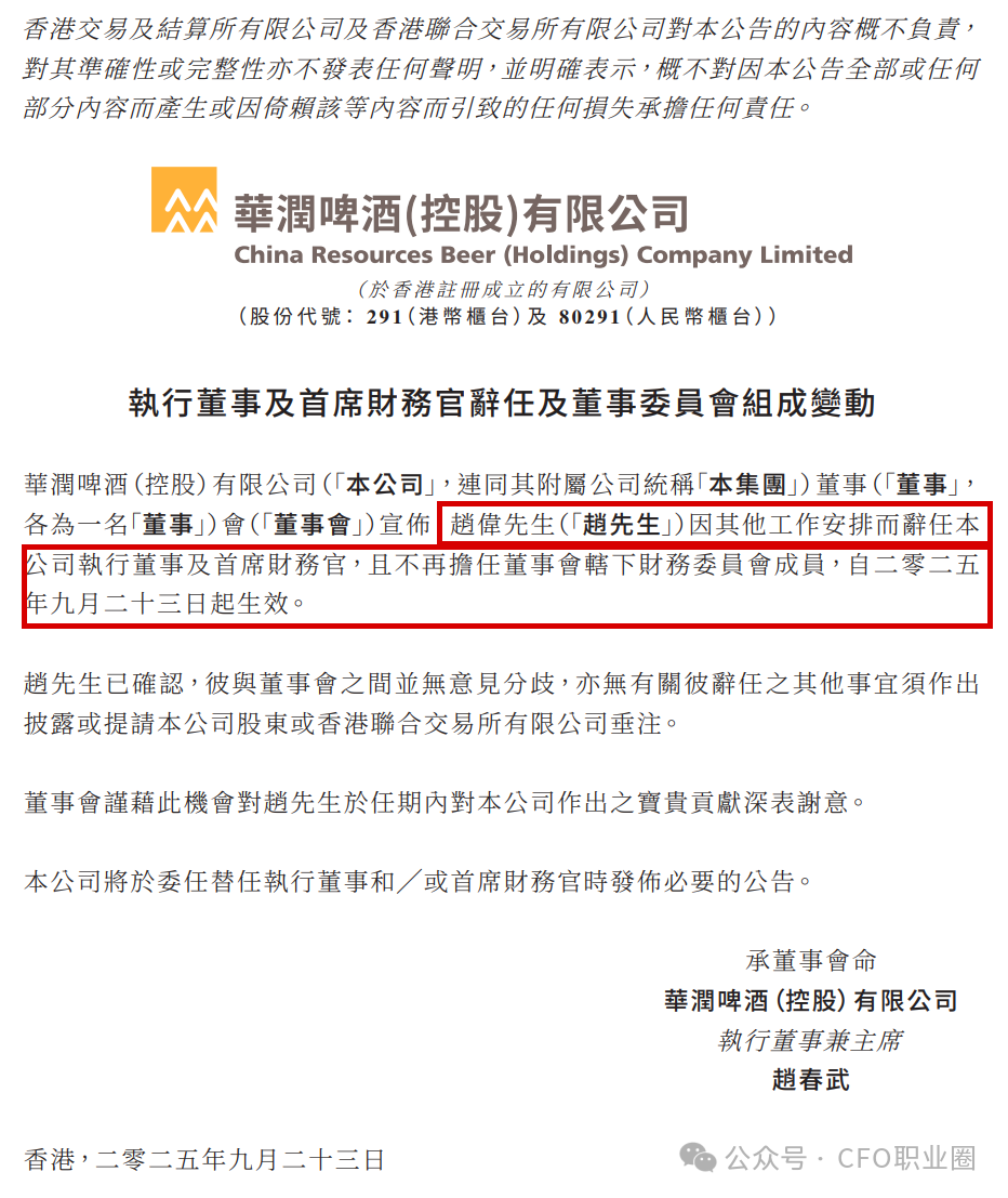 2025年9月23日,港股上市公司华润啤酒(00291.HK)发布了《执行董事及首席财务官辞任及董事委员会组成变动》的公告。公告显示,赵伟先生因其他工作安排而辞任该公司执行董事及首席财务官,且不再担任董事会辖下财务委员会成员炒股配资资讯网,自二零二五年九月二十三日起生效。
